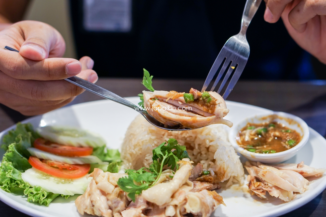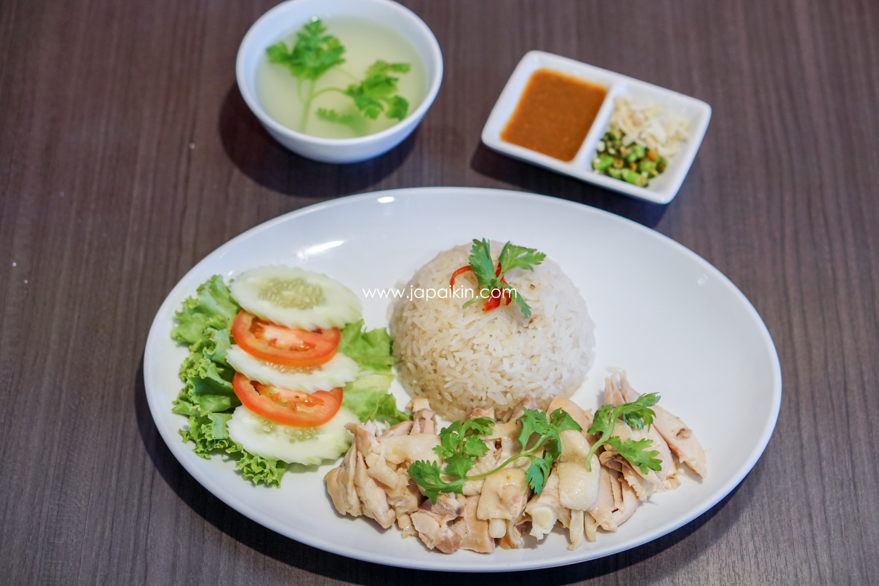 ข้าวมันไก่ (Chicken Rice with Soup) 195฿ – เมนูที่เราคุ้นเคยกันเป็นอย่างดี เสิร์ฟพร้อมกับซุป และน้ำจิ้ม พร้อมขิง และพริกซอย